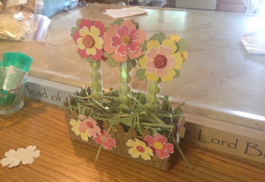 This flower arrangement is made totally from Stampin'Up! Materials. We saw this on the internet and we wanted to reproduce it so we got instructions on how to make it.. But we wanted to use only Stampin'Up!. The original used glass test tubes to put candies in them. We used the wrappers from Stampin'Up! Anyway, Wendy made this whole thing with only a little help. It was really fun. It is one of those really futzy things to create and it took Wendy a long time. But the end result was wonderful and oh so pretty.