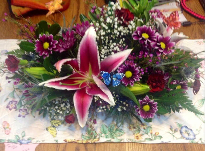 These are two very different flower arrangements from Hostess Appreciation. This one was the centerpiece on the middle of the table. It is so beautiful and the blue butterfly was for Wendy. It also had the Lilies that she loves. I have to give a lot of praise to the flower shop in Lodi. Nancy's Floral & Gifts is located at 146 S. Main St in Lodi. She is amazing. She was able to create this beautiful arrangement right away and she had really interesting flowers like thistles! So, if you need flowers, I highly recommend her!