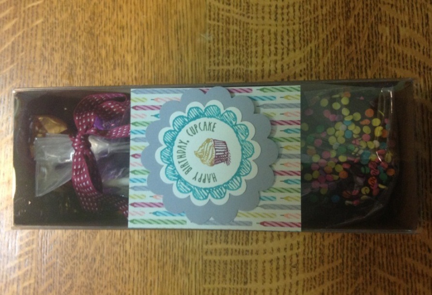 So, we what we decided to do for our Hostesses this year is these cute little boxes. Did you know that Stampin'Up! sells these cool little boxes? (see page 158) They are so fun. We love these boxes. We have been using these for everything! These boxes fit just perfectly some candy from Godiva and a Godiva special lollipop.