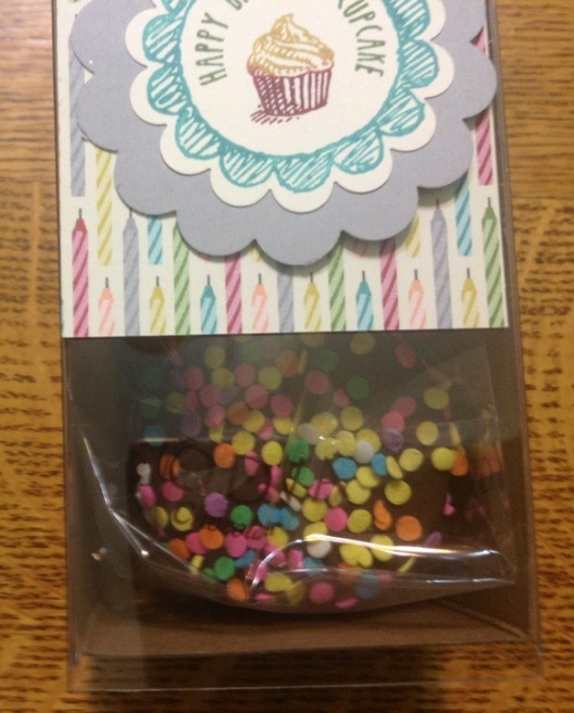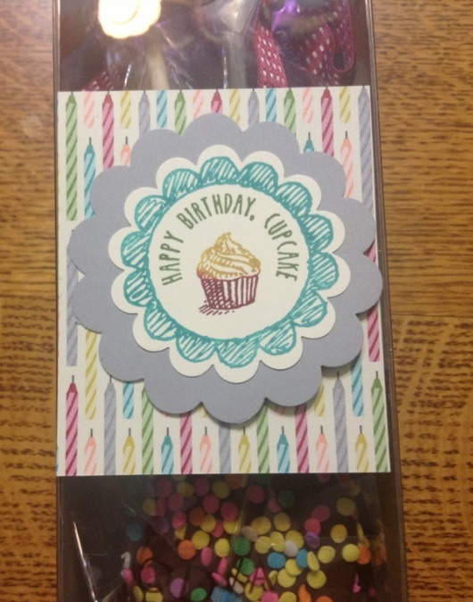 We decorated the top with some Birthday Basics Designer Series Paper and we used the Sketched Birthday stamp set. I inked it up with markers and punched it out with the 1 3/4" scallop circle punch. This is actually a coupon good for a discount during their birthday month.